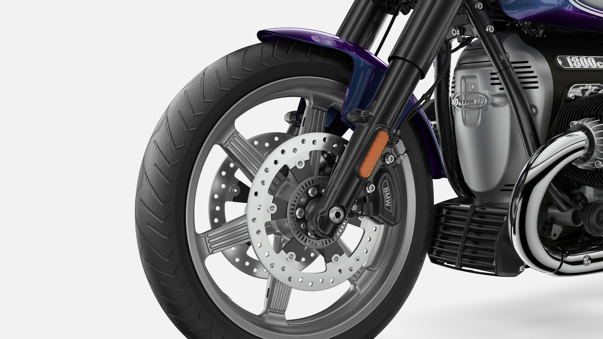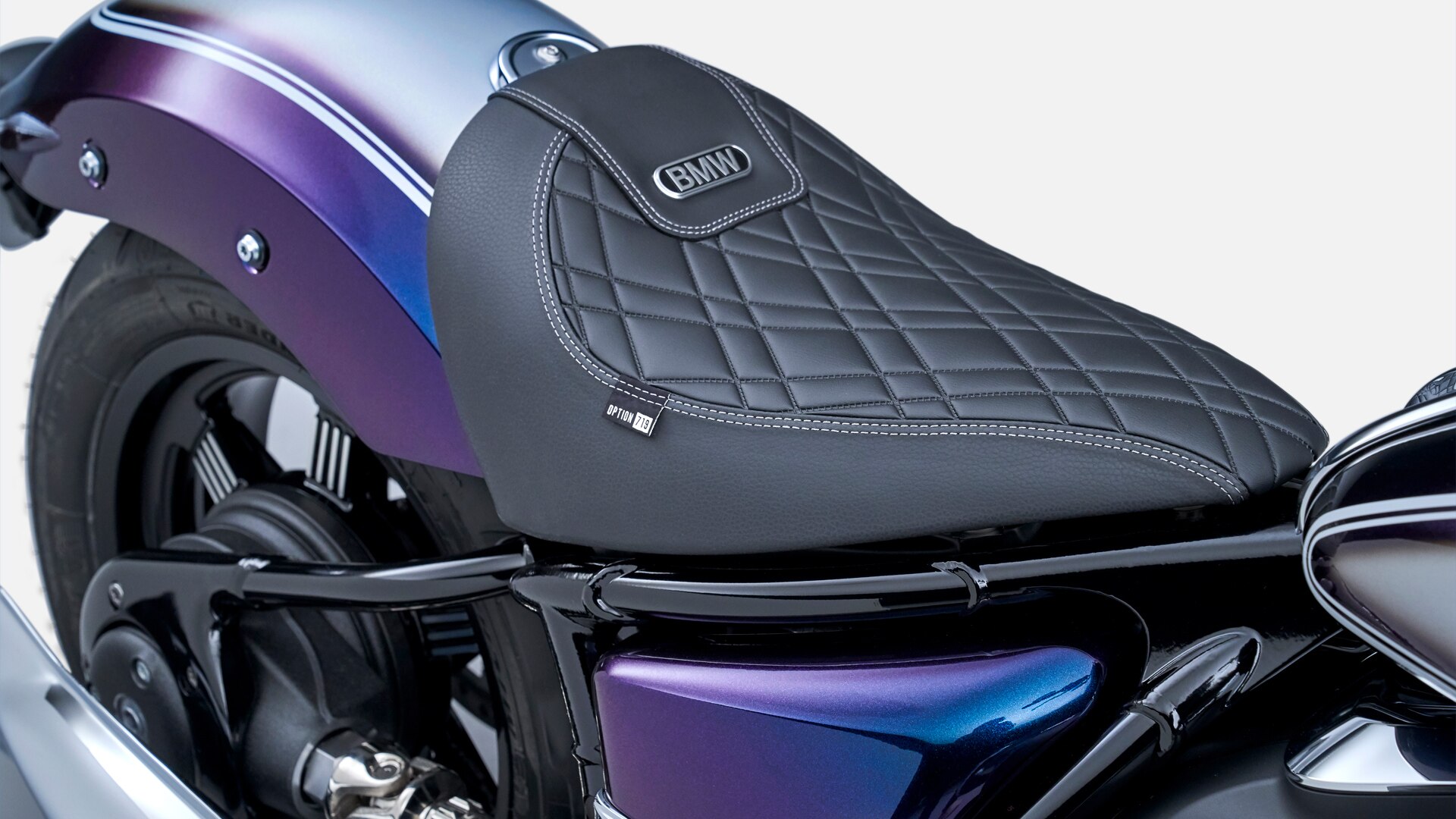 Nuestra opción 719 abre una serie de oportunidades para darle a la R 18 un toque personal. La rueda de fundición Option 719 Bicolour Icon completa el aspecto de alta calidad de la motocicleta. El asiento Opción 719 de cuero artificial negro con costuras y relieves de diamantes, así como la insignia BMW bordada, hacen que cualquier viaje sea aún más cómodo.
